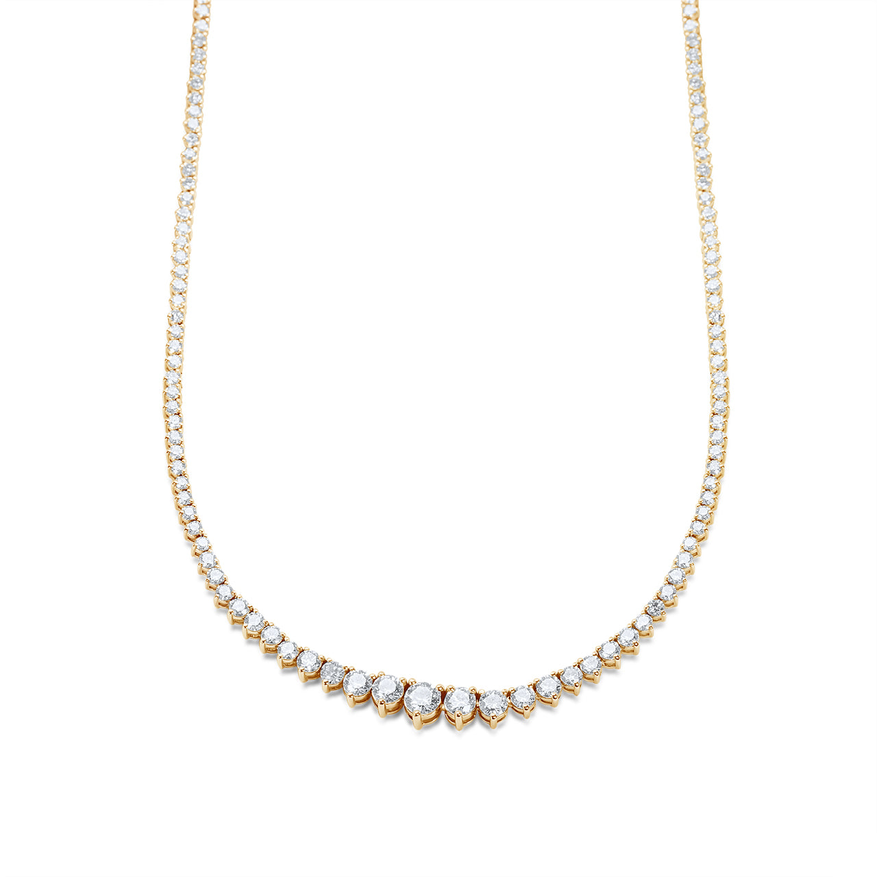 This Diamond Graduated Tennis Necklace features 6 carats total weight of round brilliant diamonds, artfully arranged in a graduated design that tapers from smaller stones near the clasp to larger diamonds at the center. The effect creates a natural focal point, highlighting brilliance and elegance around the neckline.