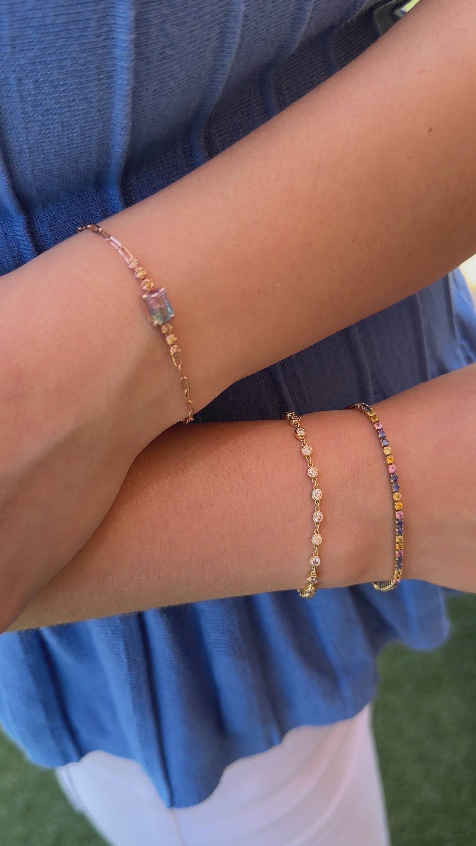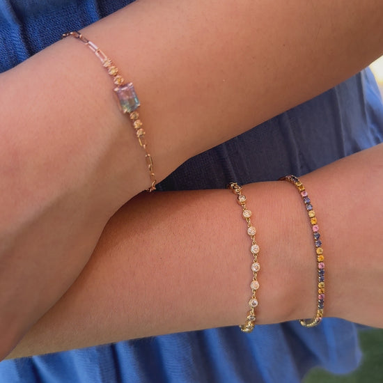 One-of-a-kind bracelet showcasing a natural Watermelon Tourmaline gemstone, embellished with diamonds on the side for a playful and delicate aesthetic set in a 18K Rose Gold paperclip chain.